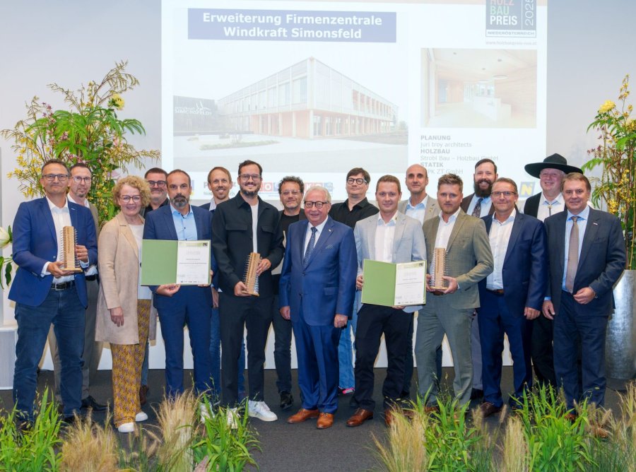 This year marked the 20th anniversary of the awards for the best timber construction projects in Lower Austria. A jury of experts selected winners in four categories from among 85 entries. The Windkraft Simonsfeld company headquarters received the timber construction award in the ‘Conversion and Extension/Renovation’ category. The award ceremony took place at Blaha Büromöbel in Korneuburg and highlighted the high status that wood now enjoys as a sustainable building material in architecture.