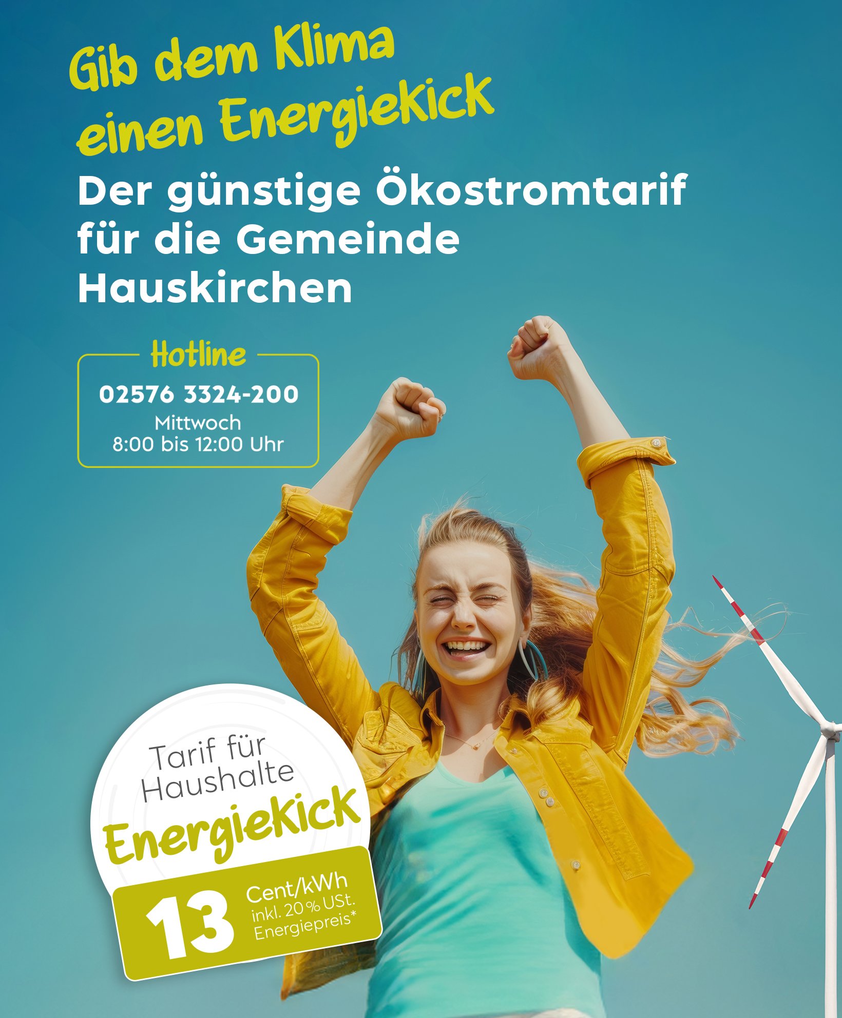 Der Energiekick besteht aus 100 % erneuerbarer Energie aus Österreich mit einem entsprechenden Anteil an Windstrom der Windkraft Simonsfeld.