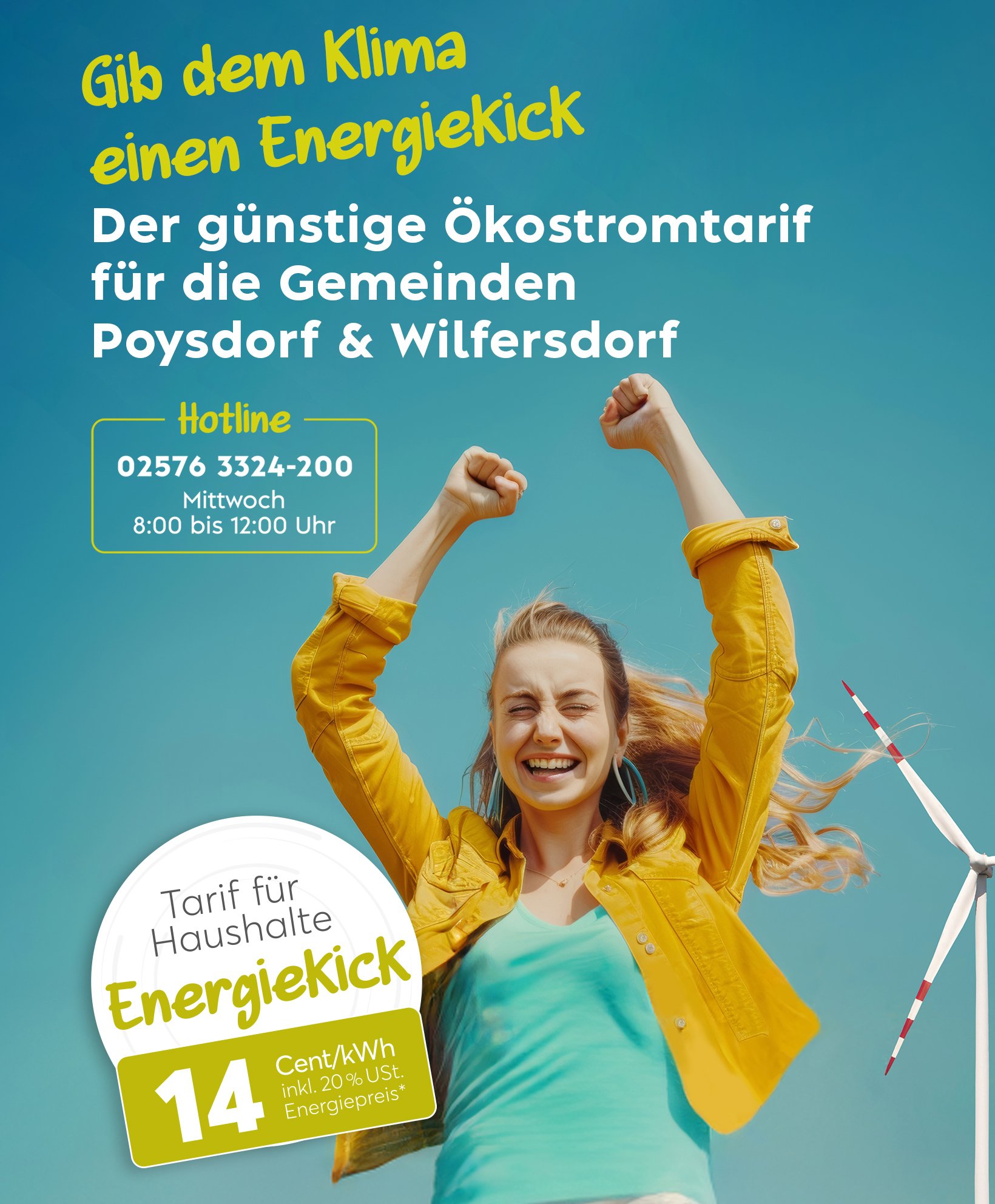 Als Windkraft Simonsfeld können wir – in Kooperation mit unserem Partner, der oekostrom AG – unseren Projektgemeinden Poysdorf & Wilfersdorf einen attraktiven, langfristigen Ökostromtarif anbieten