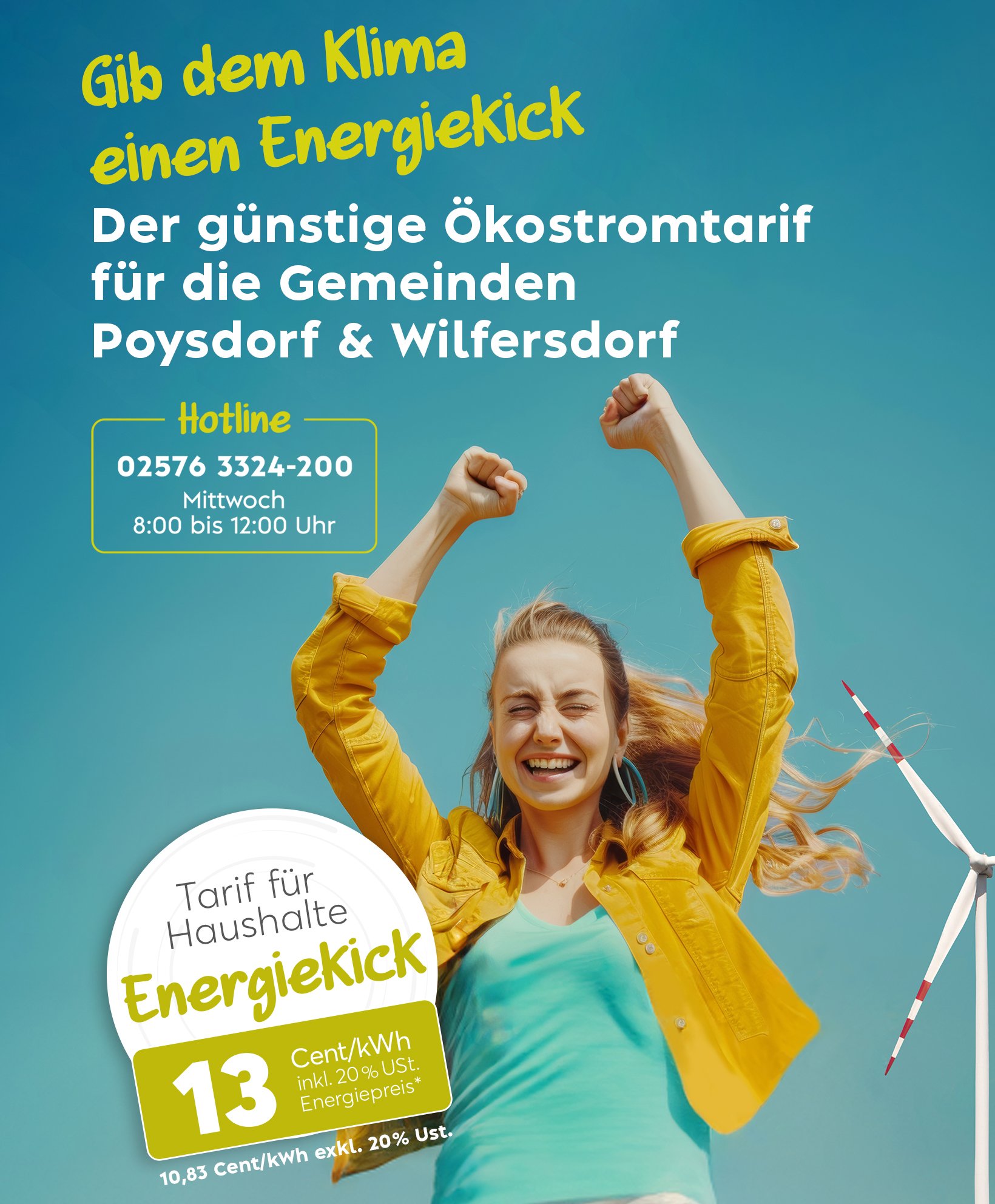 Als Windkraft Simonsfeld können wir – in Kooperation mit unserem Partner, der oekostrom AG – unseren Projektgemeinden Poysdorf & Wilfersdorf einen attraktiven, langfristigen Ökostromtarif anbieten