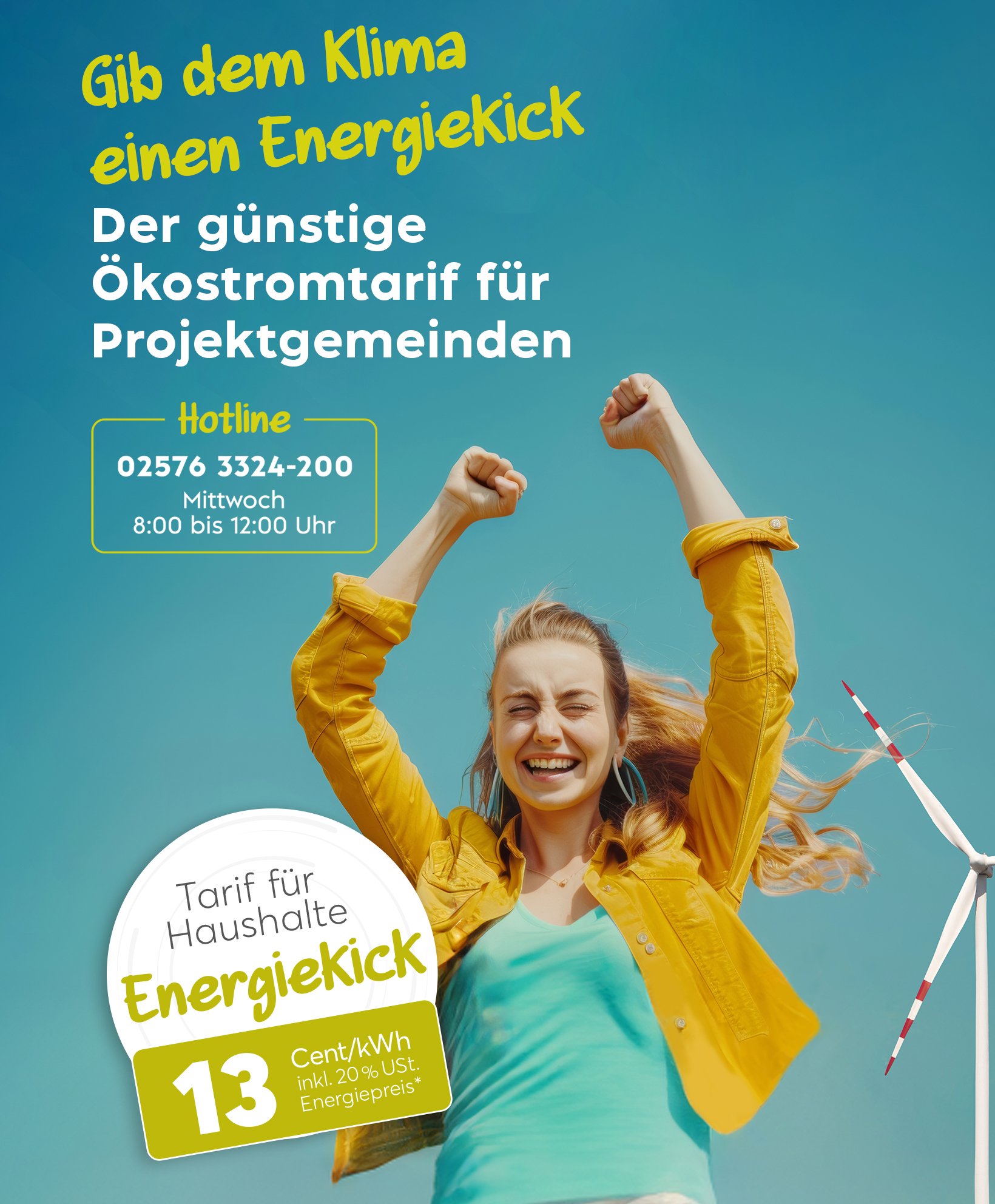 Der angegebene Energiepreis ist gültig für alle Privatkunden, die einen Neuvertrag ab 01.01.2026 abschließen. Zu beachten ist eine eventuelle Bindefrist beim aktuellen Stromanbieter. Gilt auch für Bestandskunden, die einen Wechsel, nach der Mindestvertragsbindung von 1 Jahr, zum Energiekick 2026 durchführen.