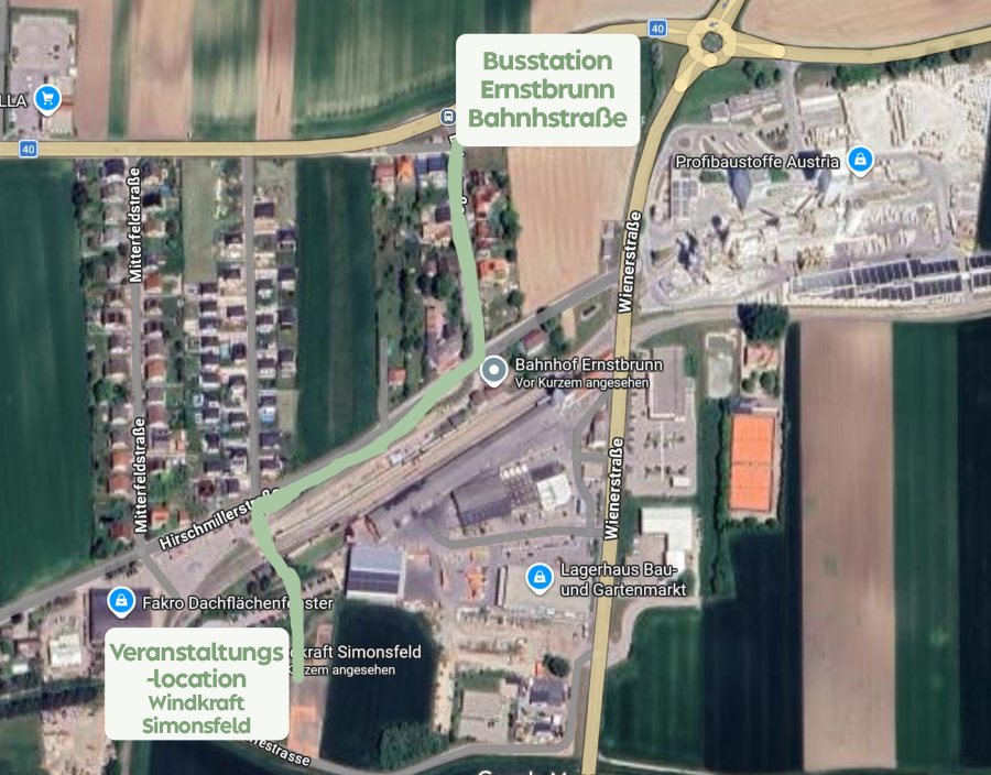 Hier finden Sie den Linienplan von Ernstbrunn. Hier gehen Sie ca. 10 Minuten von der Windkraft Simonsfeld zu der Bushaltestelle: Ernstbrunn Bahnhstraße (Zugang Hirschmillerstraße).