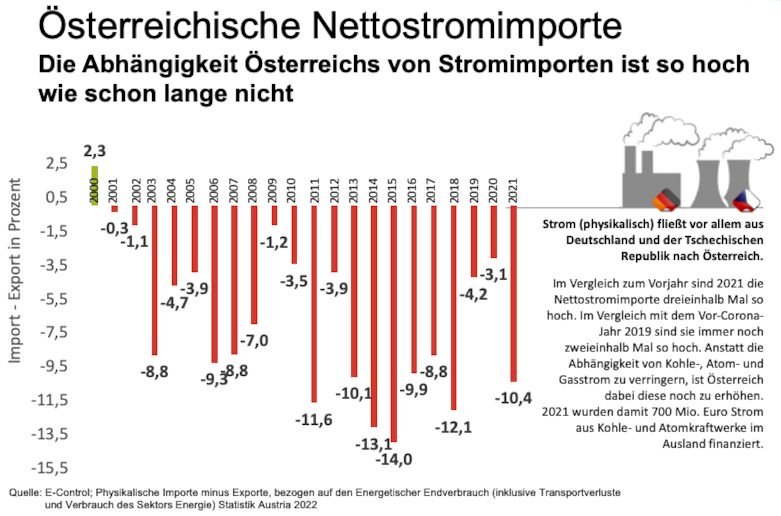 Im Vergleich zum Vorjahr sind die Nettostromimporte in Österreich um das Dreieinhalbfache gestiegen, dies entspricht einem Anteil von 10,4 Prozent am Stromverbrauch. 700 Mio. € wurden damit an Kohle- und Atomkraftwerke im Ausland gezahlt. „Wir brauchen den Ausbau der erneuerbaren Energien dringender denn je“, fordert Stefan Moidl, Geschäftsführer der IG Windkraft: „Die erneuerbaren Energien sind der Garant für eine unabhängige Energieversorgung. Es ist Zeit, den nötigen Ausbau endlich zu beginnen.“