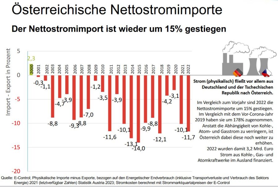 Österreichs Nettostromimport ist 2022 um 15 Prozent gegenüber 2021 angestiegen. Mit 11,7 Prozent des Stromverbrauchs liegt dieser Wert deutlich über dem Durchschnitt der letzten 20 Jahre. Dadurch flossen im vergangenen Jahr 3,2 Mrd. € in ausländische Kohle-, Atom- und Gaskraftwerke.