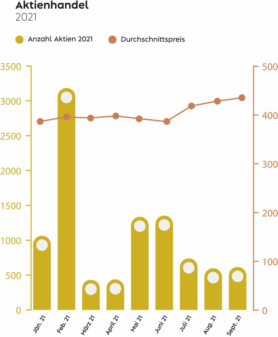 Auf durchwegs hohem Niveau lagen die Preise der Aktientrades auf unserem Handelsplatz: Im ersten Halbjahr wurde unsere Aktie durchschnittlich um 392,4 € gehandelt. Ab Juli war ein konstanter Preisanstieg verzeichnen, der monatliche Durchschnittspreis unserer Aktie erreichte im September 435,5 € je Aktie – das ist der höchste jemals erzielte Wert.