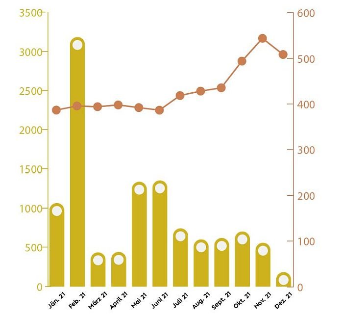 Insgesamt wurden 11.198 Aktien der Windkraft Simonsfeld AG gekauft bzw. verkauft. Der Durchschnittspreis unserer Aktie betrug 414,2 € je Aktie und lag damit um 18 % über dem Wert von 2020.