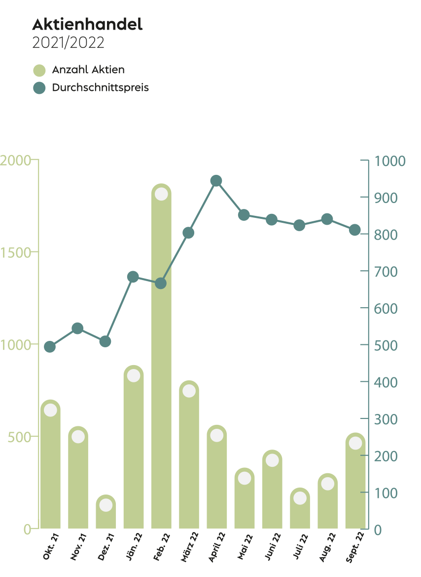 Insgesamt wurden von Juli bis September 1.042 Aktien gehandelt. Die monatlichen Durchschnittspreise bewegten sich zwischen 811 € und 840 € je Aktie. Das gesamte gehandelte Aktienvolumen in den ersten drei Quartalen 2022 erreichte bisher insgesamt rund 4,5 Mio. €.