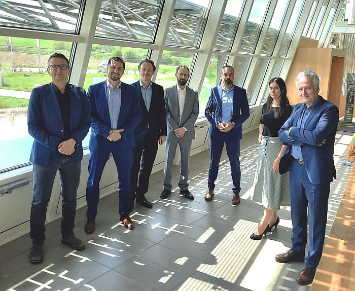 Vorstand Alexander Hochauer, Mag. Wilhelm-Christian Anderle (Erste Bank), Dr. Uwe Rautner, Mag. Rene Semmelweis, Vorstand Markus Winter, Dr. Birgit Eigelsreiter und Dr. Gerald Klauss (Erste Bank) bei der Vertragsunterzeichnung in Ernstbrunn