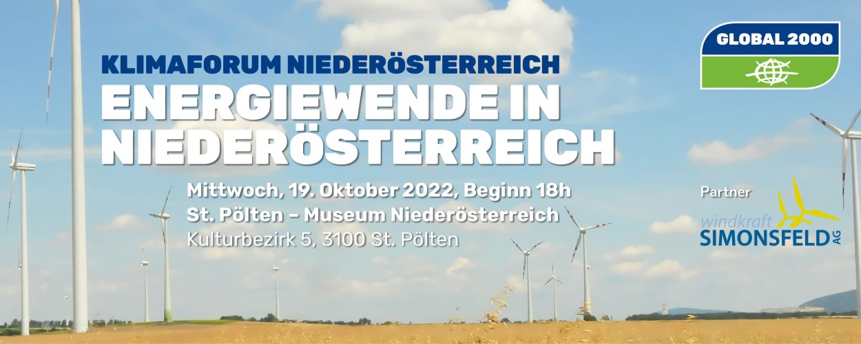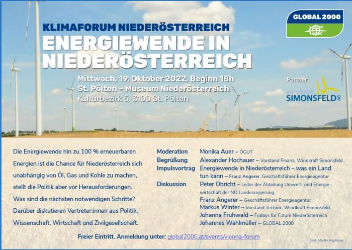 Die Energiewende hin zu 100 % erneuerbaren Energien ist die Chance für Niederösterreich sich unabhängig von Öl, Gas und Kohle zu machen. Die Klimakrise trifft das Land bereits und auch dafür ist eine Umstellung der Energieversorgung unumgänglich. Welche Möglichkeiten gibt es Öl, Gas und Kohle hinter uns zu lassen? Der Ausstieg aus Öl- und Gasheizungen stellt auch in Niederösterreich die Politik vor Herausforderungen. Zusätzlich gilt es den Ausbau von naturverträglichem Ökostrom zu organisieren. Was hat die NÖ Landesregierung im Bereich Klimaschutz vor? Bei einer hochkarätigen Diskussionsveranstaltung unterhalten sich darüber Vertreter von Politik, Wissenschaft, Wirtschaft und Zivilgesellschaft.