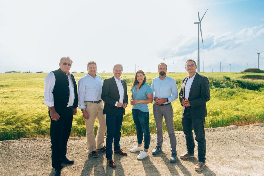 v.l.n.r.: Bürgermeister Dürnkrut Herbert Bauch, CEO W.E.B. Frank Dumeier, Landtagspräsident Karl Wilfing, Jennifer Frank, Moderatorin, CTO Windkraft Simonsfeld Markus Winter, CFO Windkraft Simonsfeld Alexander Hochauer