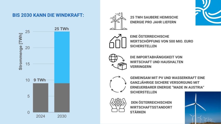 Die kommende Bundesregierung entscheidet über das größte Projekt seit der Reindustrialisierung: Österreichs Versorgungssicherheit mit leistbarer und sauberer Energie. Das sichert unseren Wohlstand für Generationen. Dafür kann die Windkraft bis 2030 jährlich 25 TWh heimische Energie bereitstellen.