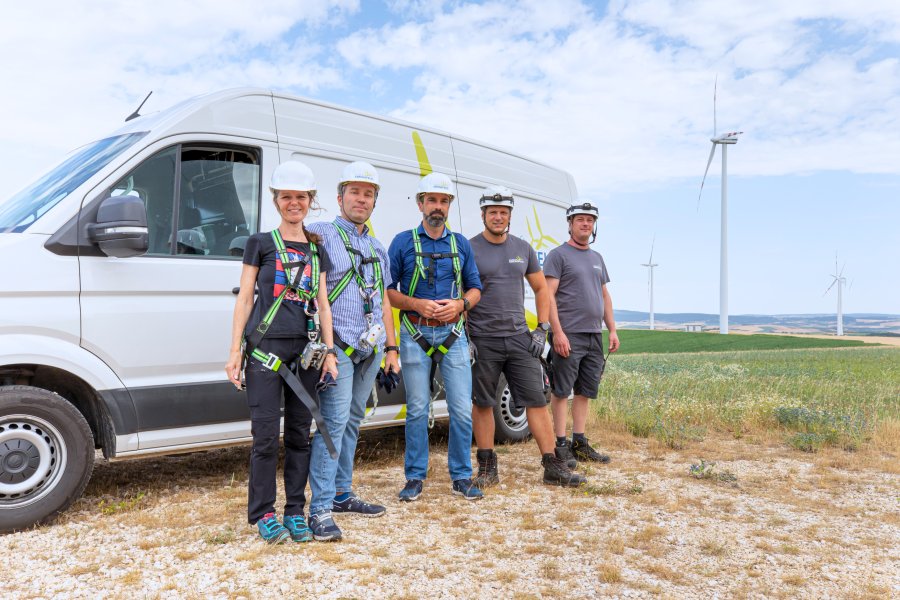 v.l.n.r.: Marlies Gatterbauer (Vorstandsbüro AMS), Johannes Kopf (AMS Vorstandsvorsitzender), Markus Winter (Vorstand Technik, Windkraft Simonsfeld), Rene Rezsetar (Servicetechniker), David Viktorik (Servicetechniker) / Foto: © Klaus Rockenbauer