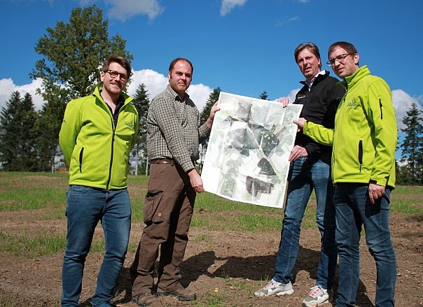 v.l.n.r: Projektleiter Jonathan Brendel, der Förster des Stifts Geras, Markus Phillip, Bürgermeister Franz Göd und Christoph Hofbauer, Leiter der Projektentwicklung bei der Windkraft Simonsfeld AG. Wir haben das Foto vor einem der geplanten Anlagenstandorte gemacht.