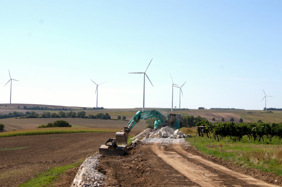 Die Arbeiten für die drei neuen Windräder des Herstellers Nordex sind bereits in vollem Gange. Bei den ersten zwei Anlagen hat der Wegebau inzwischen begonnen. Hier wurde auch zum Teil der restliche Schotter vom Windpark Dürnkrut für den Wegebau verwendet. Mit Ende nächster Woche sind die Schüttungsarbeiten bei den ersten zwei Anlagen abgeschlossen. Anschließend beginnt der Wegebau für unser drittes Windrad. Bei diesem wurden diese Woche die archäologischen Arbeiten fertig gestellt. Der nächste Schritt ist dann die Gründung bei den drei Anlagen.