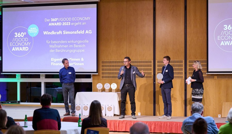 Der 360°//GOOD ECONOMY AWARD wird für den vorbildlichen, gemeinwohl-orientierten Umgang mit allen Stakeholdern eines Unternehmens verliehen. Ausgezeichnet werden Unternehmen, die hier herausragende Maßnahmen mit großer Wirkung umsetzen. Die Windkraft Simonsfeld erhielt den Preis für ihr Angebot an die Bevölkerung, sich über Anleihen und Aktien aktiv an der Klima- und Energiewende zu beteiligen.