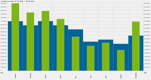 Mit einer Gesamtproduktion von insgesamt 555,61 Mio. kWh im laufenden Jahr liegen wir derzeit 11,6 % vor dem Plan und konnte die Minderproduktion der windschwachen Sommermonate mehr als kompensieren.